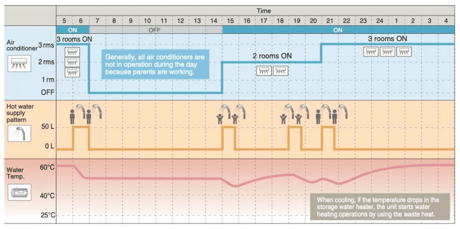 Panas yang digunakan berasal dari limbah panas yang keluar dari outdoor AC. Limbah panas yang seharusnya dibuang keluar kini dimanfaatkan untuk memanaskan air, bisa dikatakan biaya listrik untuk memanaskan air tidak ada.